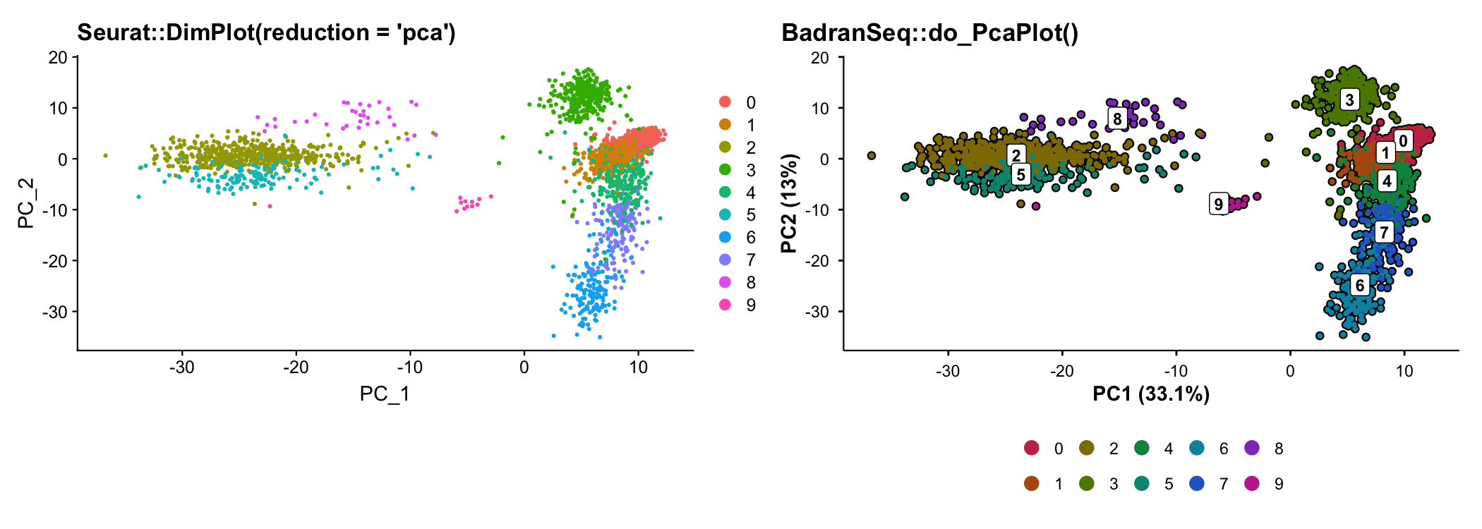 Seurat’s PCA plot shows “PC_1” and “PC_2” with no indication of how much variance each component explains. BadranSeq computes and formats this automatically.
