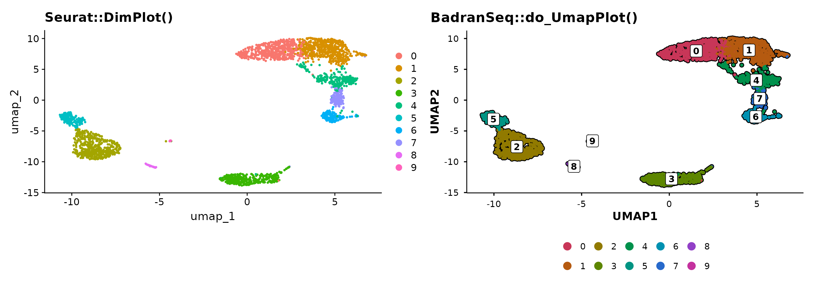 BadranSeq wraps this into a small set of functions with opinionated defaults: cell borders on, cluster labels on, clean white theme, legend at bottom. The goal is a plot that looks good in a paper without additional customisation.