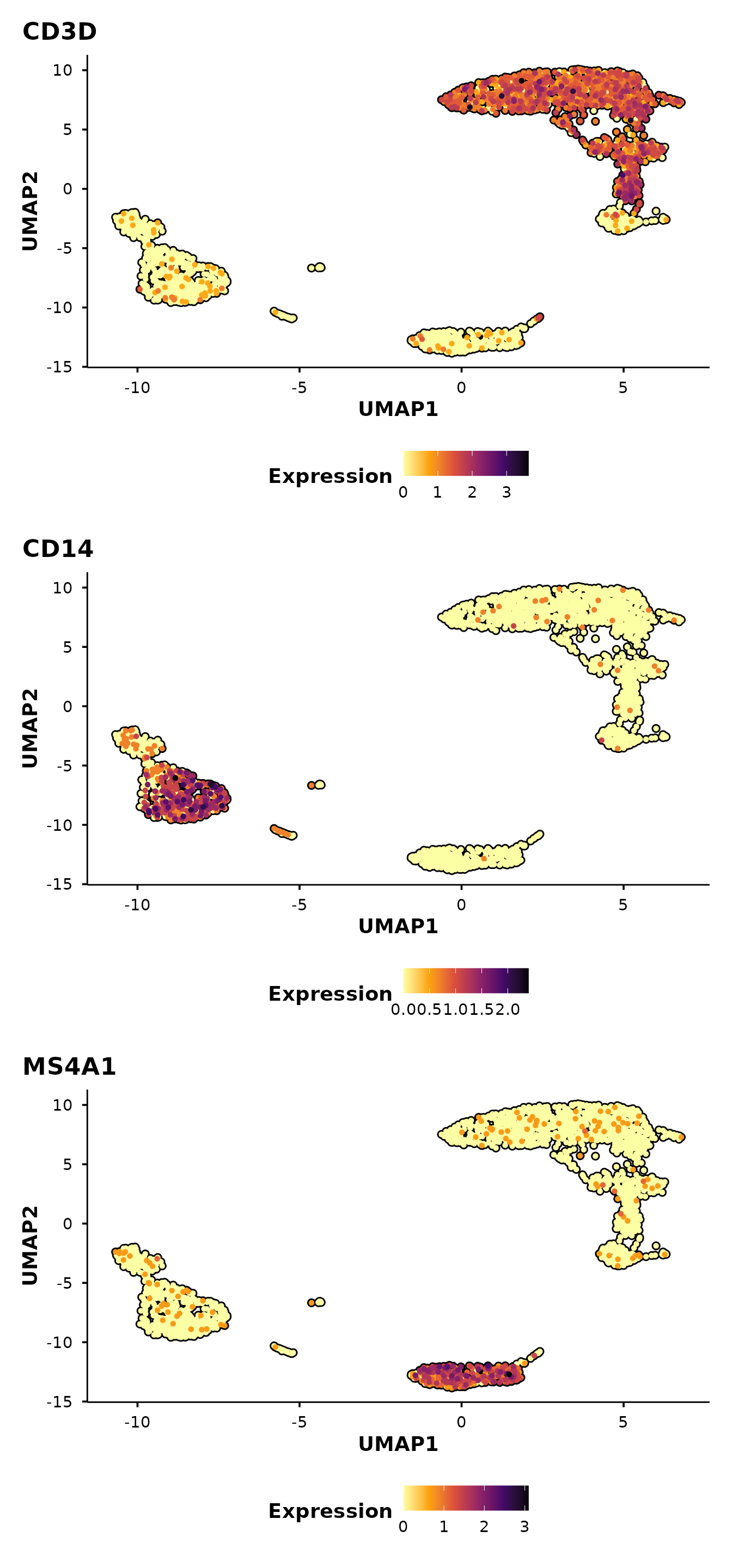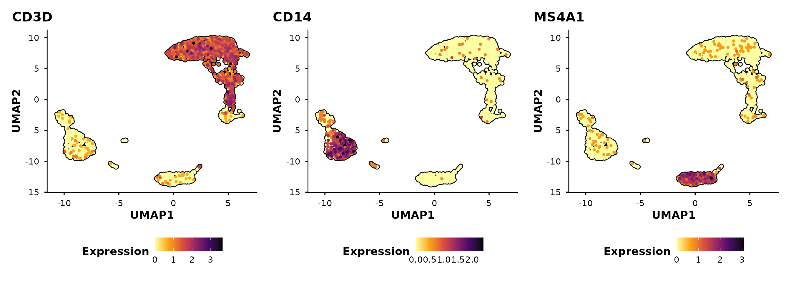 do_FeaturePlot(pbmc3k, features = c("CD3D", "CD14", "MS4A1"))