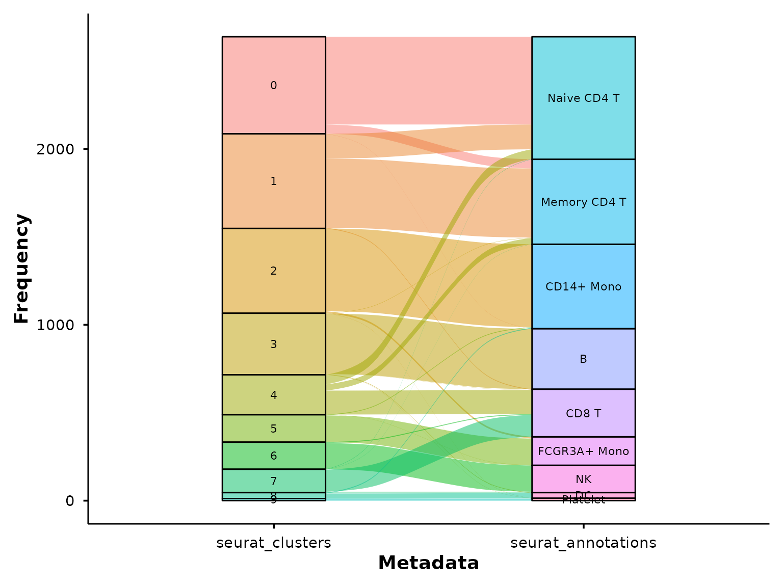 columns = c("seurat_clusters", "seurat_annotations"))## 62 cell(s) with NA values excluded from plot.