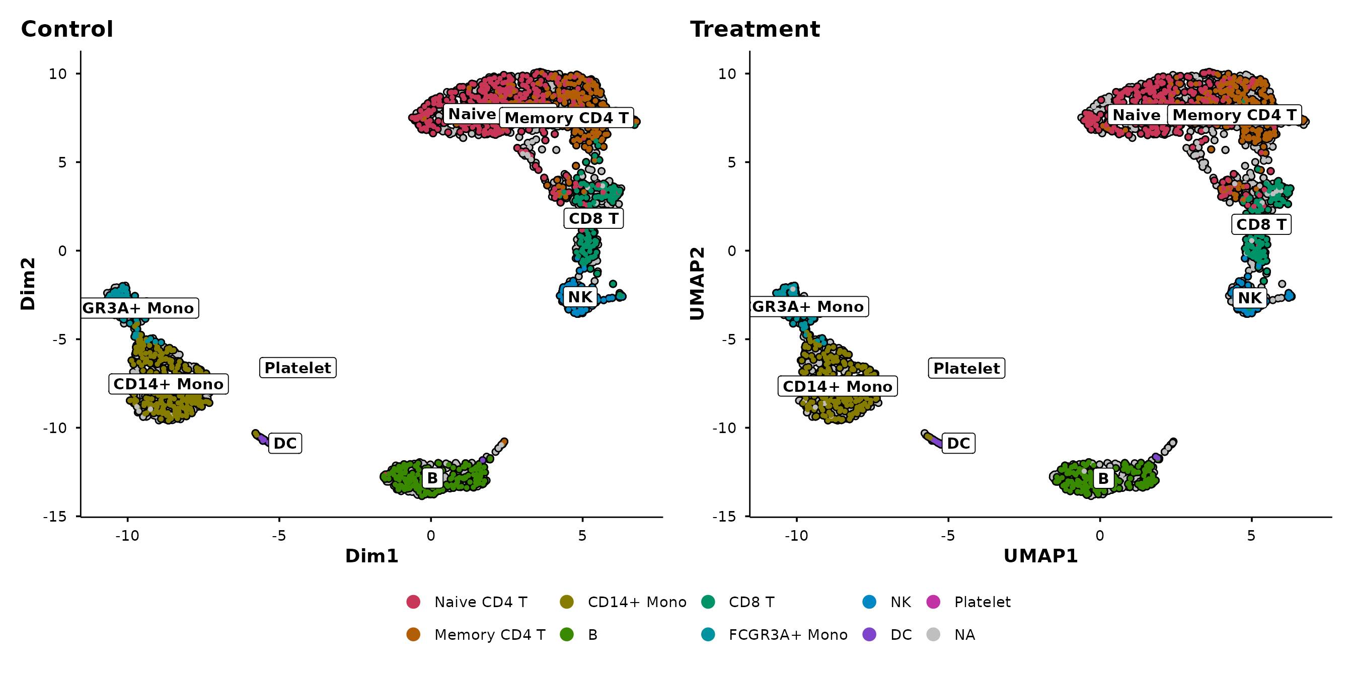 do_UmapPlot(pbmc3k, group.by = "seurat_annotations", split.by = "condition")