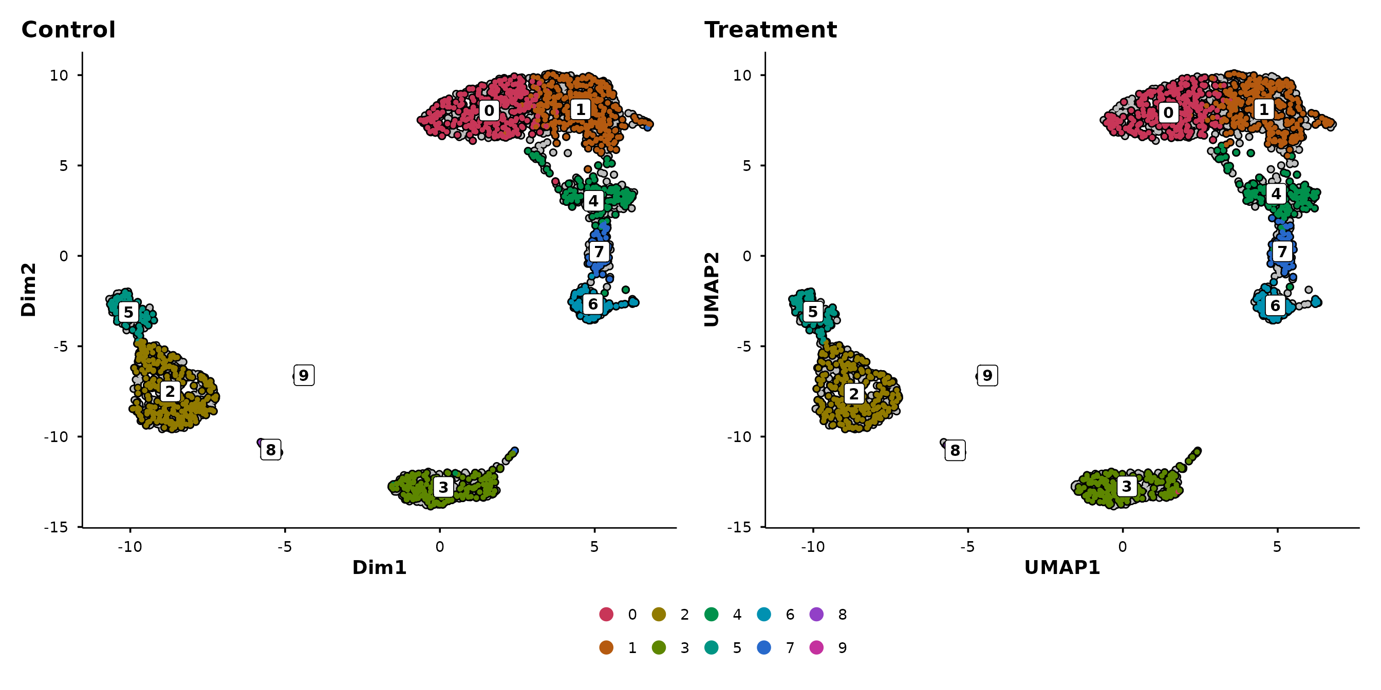 In the Seurat version, each panel only shows its own cells — you lose the sense of where those cells sit in the overall structure. In BadranSeq’s version, the grey background preserves this context: you can immediately see which clusters are enriched in each condition.