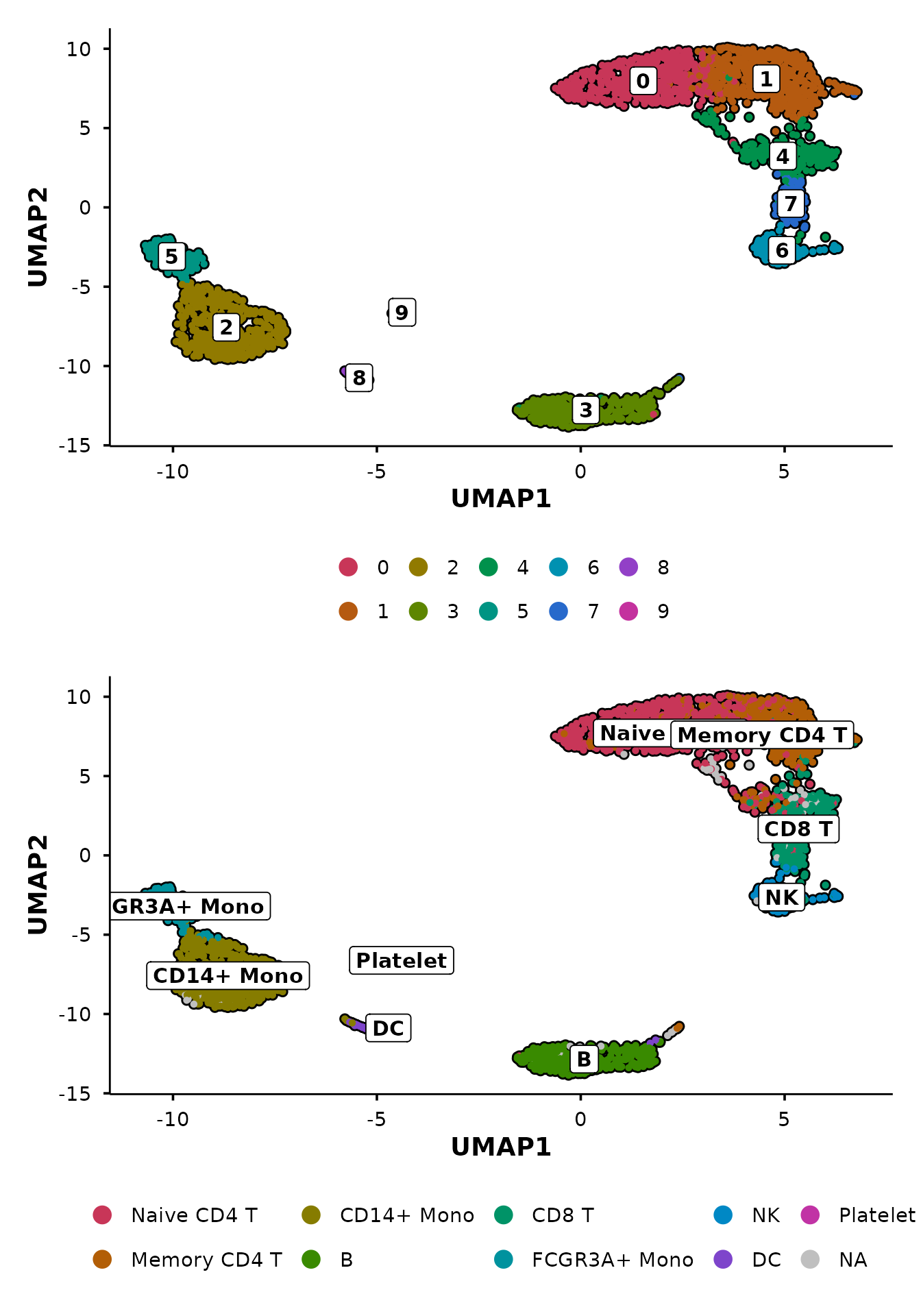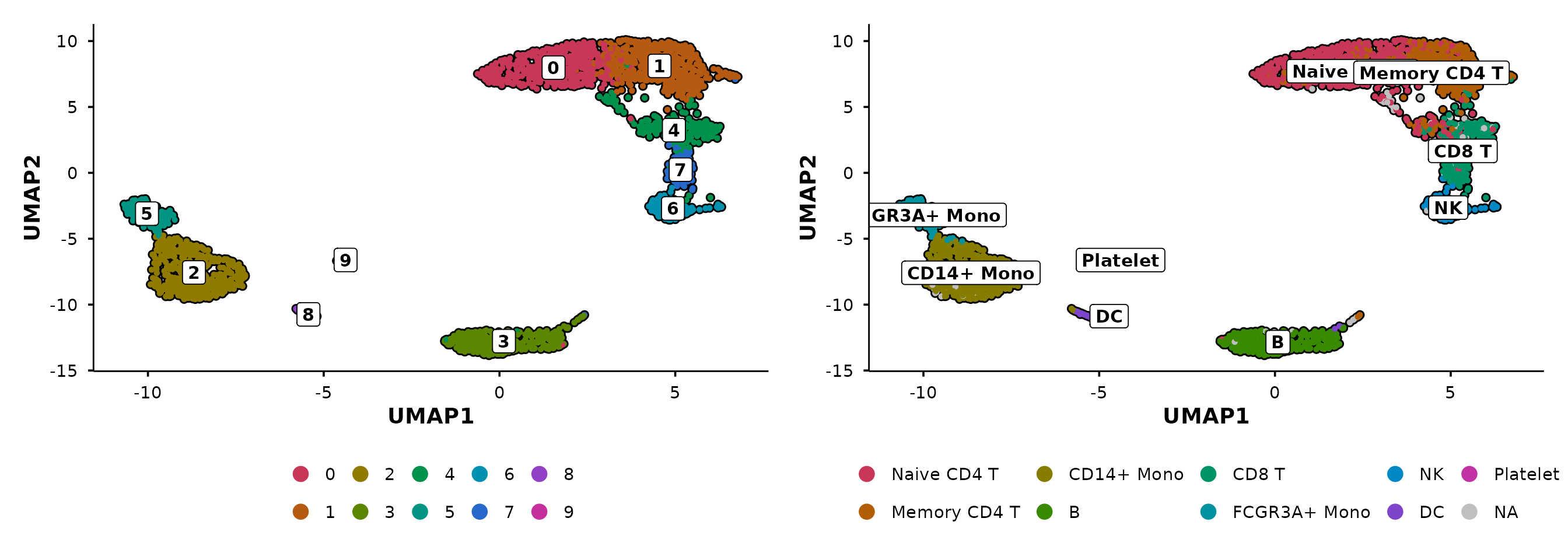 do_UmapPlot(pbmc3k, group.by = c("seurat_clusters", "seurat_annotations"))